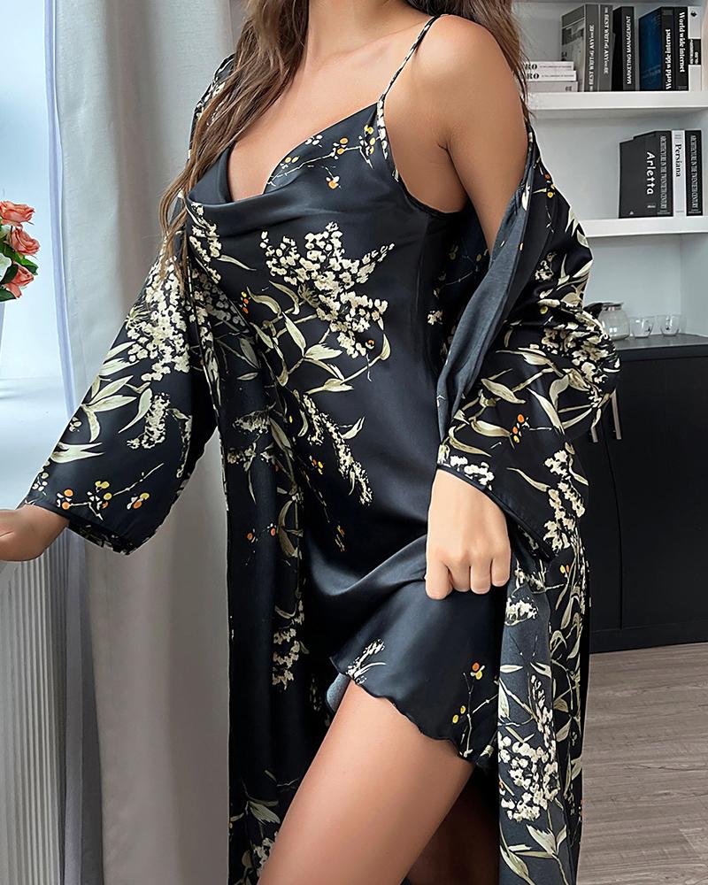 3PCS Crochet Lace Leopard Print Cami Set With Robe