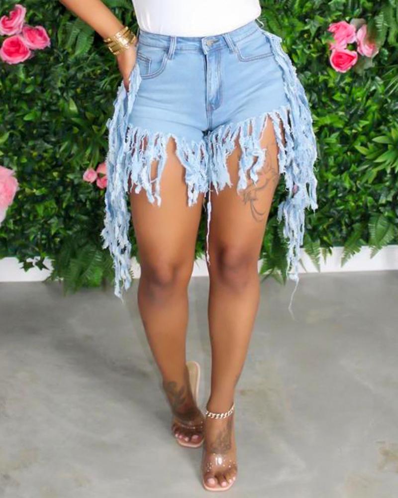 Tassel Design Cutout Fringe Hem Denim Shorts