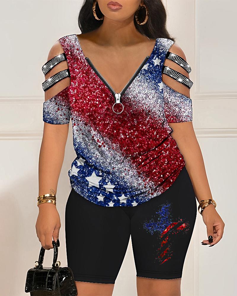 Style:Casual Type:Shorts Set Material:97%Polyester,3%Spandex Neckline:Cold Shoulder Sleeve Style:Short Sleeve Length:Above Knee Pattern Type:Flag,Graphic Decoration:Cutout,Rhinestone,Zipper Fit Type:Regular Occasion:Daily,Vacation Package Include:1*Shorts Set Fabric Elasticity:Slight Stretch Sheer:Yes Care Instructions:Machine wash or professional dry clean