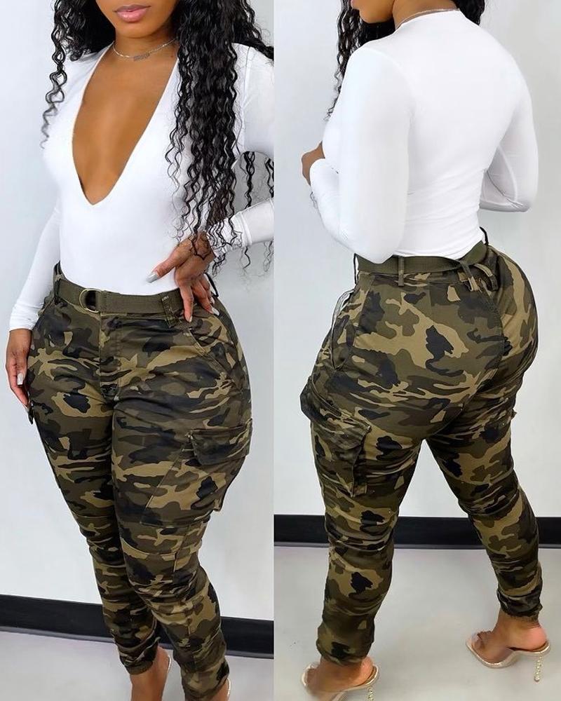 Camouflage Print Pocket Detail Pants With Belt