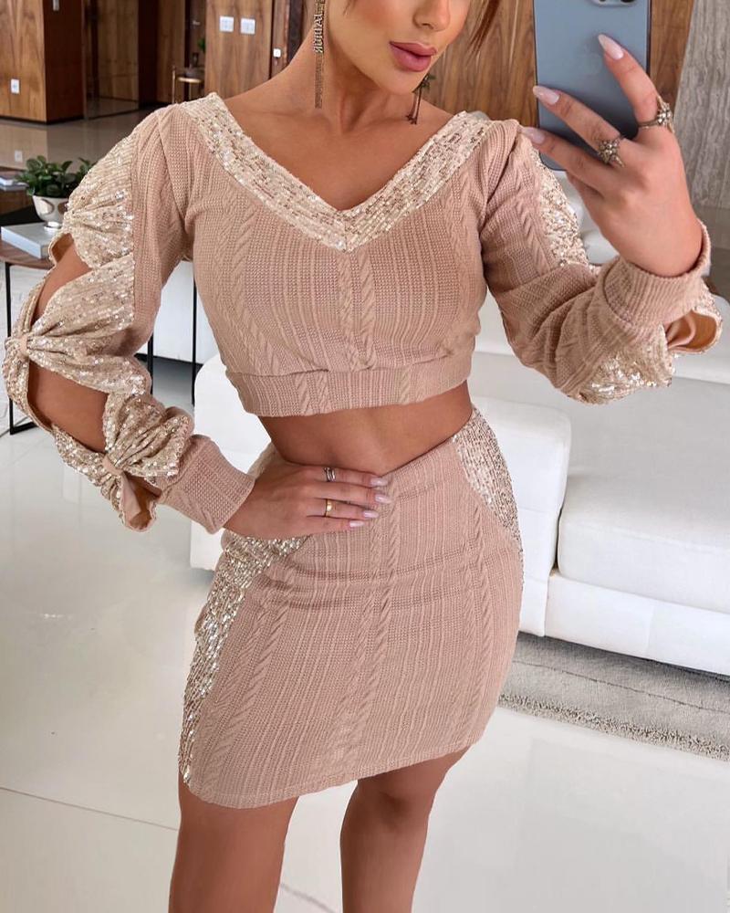 Contrast Sequin Cutout Long Sleeve Crop Top & Skirt Set