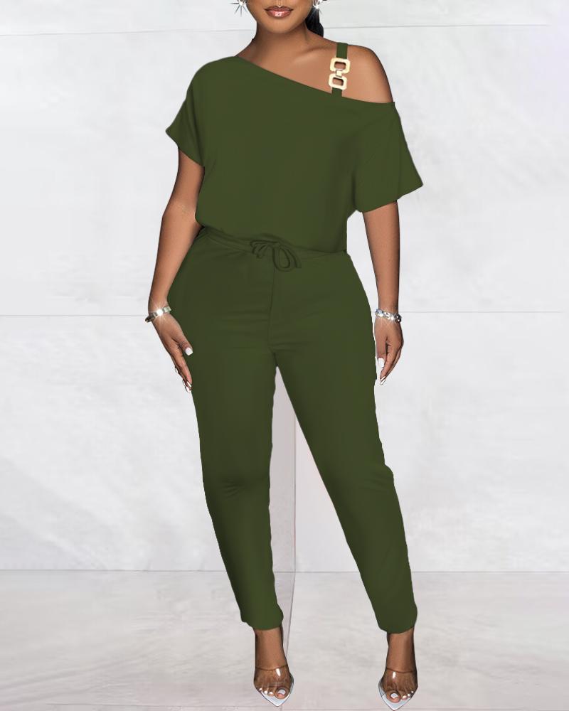 Style:Casual Type:Jumpsuit Material:97%Polyester,3%Spandex Neckline:Cold Shoulder Sleeve Style:Short Sleeve Length:Long Pattern Type:Plain Decoration:Chain Fit Type:Regular Occasion:Daily Package Include:1*Jumpsuit Fabric Elasticity:Medium Stretch Sheer:No Care Instructions:Machine wash or professional dry clean