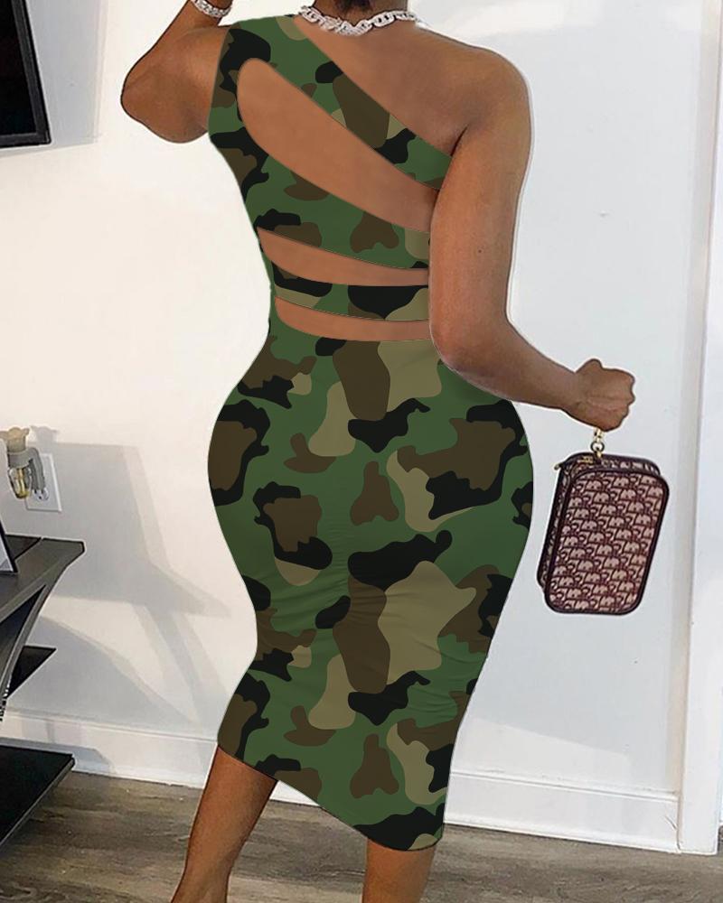 Style:Chic Type:Bodycon Material:Polyester Neckline:One Shoulder Sleeve Style:Sleeveless Length:Mid-Calf Pattern Type:Camouflage Decoration:Cutout,Ruched Fit Type:Skinny Occasion:Daily,Night Out Package Include:1* Dress Fabric Elasticity:Slight Stretch Sheer:No Care Instructions:Machine wash or professional dry clean