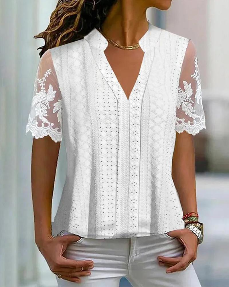 Style:Casual Type:Blouses Material:97%Polyester,3%Spandex Neckline:Stand Collar,Notch Neck Sleeve Style:Half Sleeve Length:Regular Pattern Type:Plain Decoration:Contrast Lace,Eyelet Embroidery Fit Type:Regular Occasion:Daily Package Include:1* Blouse Fabric Elasticity:Slight Stretch Sheer:Semi-Sheer Care Instructions:Machine wash or professional dry clean