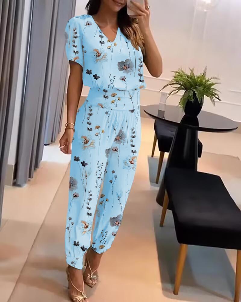 Style:Casual Type:Pants Sets Material:100%Polyester Neckline:V-Neck Sleeve Style:Short Sleeve Length:Long Pattern Type:Floral Decoration:Pocket Fit Type:Regular Occasion:Daily,Work Package Include:1*Pants Set Fabric Elasticity:Slight Stretch Sheer:No Care Instructions:Machine wash or professional dry clean