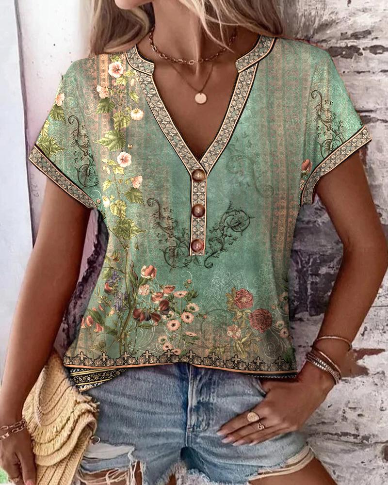 Floral Tribal Print Notch Neck Buttoned Casual T-shirt