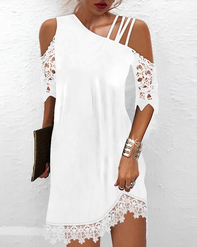 Style:Casual,Chic Type:A Line Material:97%Polyester,3%Spandex Neckline:Cold Shoulder Sleeve Style:Half Sleeve Length:Mini Pattern Type:Plain Decoration:Contrast Lace Fit Type:Regular Occasion:Daily Package Include:1* Dress Fabric Elasticity:Medium Stretch Sheer:No Care Instructions:Machine wash or professional dry clean