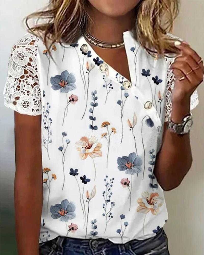 Style:Casual Type:Tee Material:97%Polyester,3%Spandex Neckline:Asymmetrical Neck Sleeve Style:Short Sleeve Length:Regular Pattern Type:Floral Decoration:Button,Contrast Lace Fit Type:Regular Occasion:Daily Package Include:1*Top Fabric Elasticity:Non-Stretch Sheer:No Care Instructions:Machine wash or professional dry clean