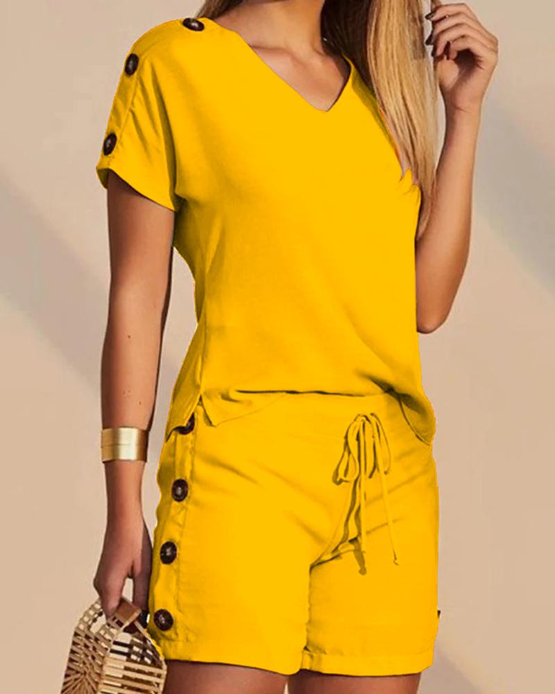 Style:Casual Type:Shorts Set Material:100%Polyester Neckline:V-Neck Sleeve Style:Short Sleeve Length:Above Knee Pattern Type:Plain Decoration:Button,Drawstring Fit Type:Regular Occasion:Daily Package Include:1*Shorts Set Fabric Elasticity:Non-Stretch Sheer:No Care Instructions:Machine wash or professional dry clean Waist Line:High Waist