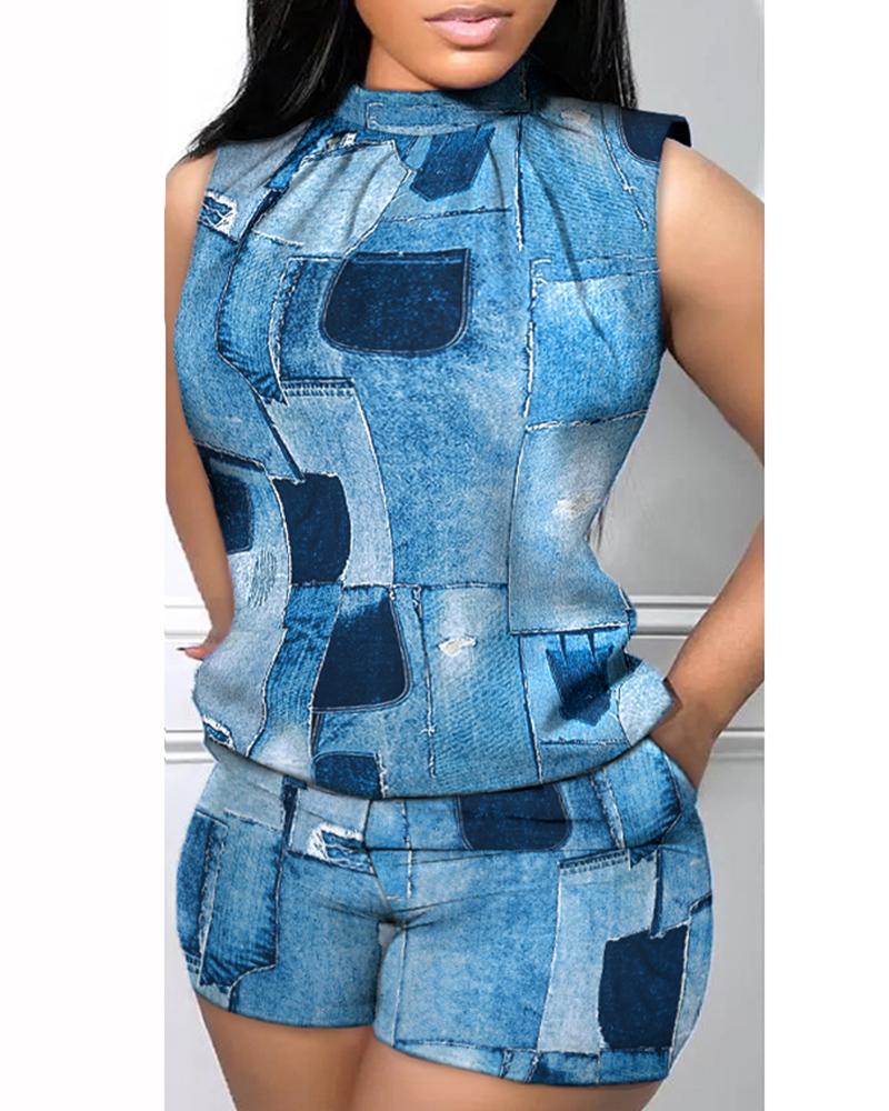 Plus Size Denim Look Print Side Slit Top & Shorts Set