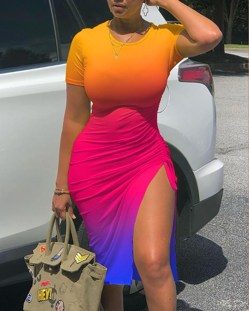 Style:Chic Type:Slit Material:97%Polyester,3%Spandex Neckline:O-neck Sleeve Style:Short Sleeve Length:Midi Pattern Type:Ombre,Tie Dye Decoration:Drawstring,Ruched,Slit Fit Type:Skinny Occasion:Daily Package Include:1* Dress Fabric Elasticity:Non-Stretch Sheer:No Care Instructions:Machine wash or professional dry clean Waist Line:Natural