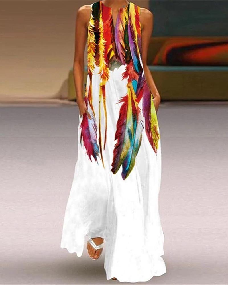 Colorful Feather Print Pocket Decor Maxi Dress