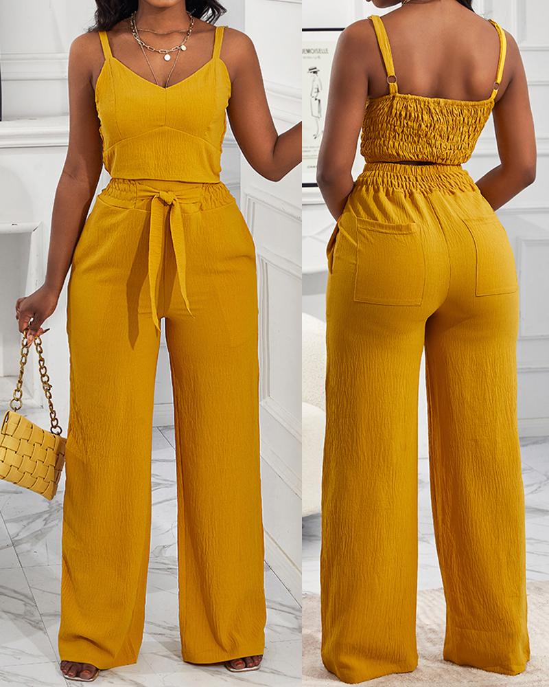 Style:Chic Type:Pants Sets Material:100%Polyester Neckline:V-Neck Sleeve Style:Sleeveless Length:Long Pattern Type:Plain Decoration:Pocket,Shirred Fit Type:Regular Occasion:Daily Package Include:Pants Sets