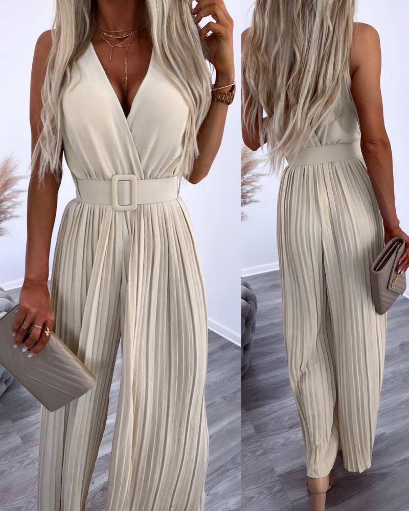 Style:Chic,Elegant Type:Jumpsuit Material:100%Polyester Neckline:V-Neck Sleeve Style:Sleeveless Length:Long Pattern Type:Plain Decoration:Ruched Fit Type:Regular With Belt:Yes Occasion:Daily,Work Package Include:1*Jumpsuit (With Belt) Fabric Elasticity:High Stretch Sheer:No Care Instructions:Machine wash or professional dry clean