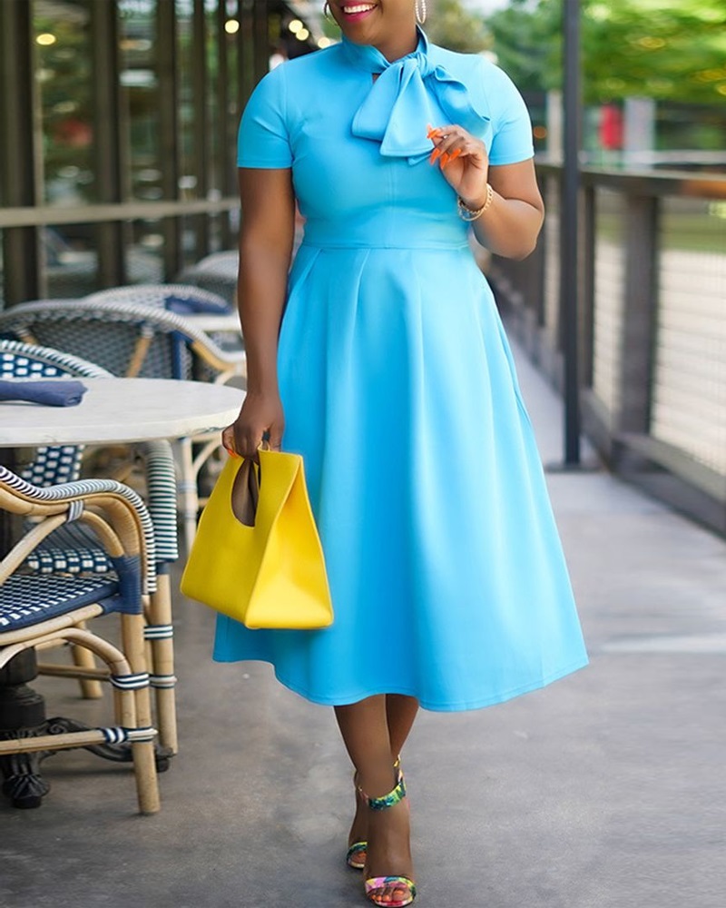 Style:Casual,Chic Type:A Line Material:95%Polyester,5%Elastane Neckline:Tie Neck Sleeve Style:Short Sleeve Length:Mid-Calf Pattern Type:Plain Decoration:Ruched,Tied Detail Fit Type:Regular Occasion:Daily Package Include:1*Dress Fabric Elasticity:Medium Stretch Sheer:No Care Instructions:Machine wash or professional dry clean Waist Line:High Waist