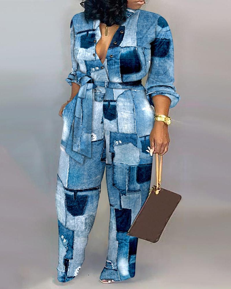 Plus Size Denim Look Print Long Sleeve Belted Jumpsuit