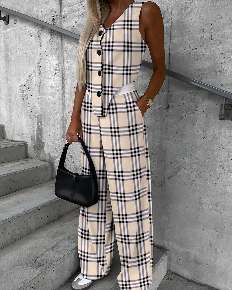Style:Chic Type:Pants Sets Material:100%Polyester Neckline:V-Neck Sleeve Style:Sleeveless Length:Long Pattern Type:Plaid,Contrast Paneled Decoration:Button,Pocket Fit Type:Regular Occasion:Daily Package Include:1*Pants Set Fabric Elasticity:Slight Stretch Sheer:No Care Instructions:Machine wash or professional dry clean