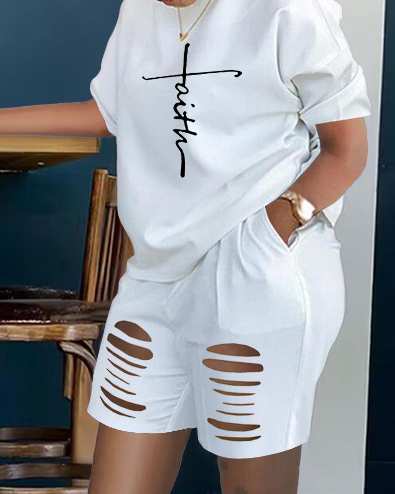 Plus Size Faith Print Ladder Cutout Casual Top & Shorts Set