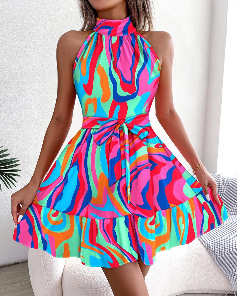 Style:Casual Type:A Line Material:Polyester Neckline:Mock Neck Sleeve Style:Sleeveless Length:Mini Pattern Type:Abstract Decoration:Ruffles,Tied Detail Fit Type:Regular Occasion:Daily Package Include:1* Dress Fabric Elasticity:Slight Stretch Sheer:No Care Instructions:Machine wash or professional dry clean