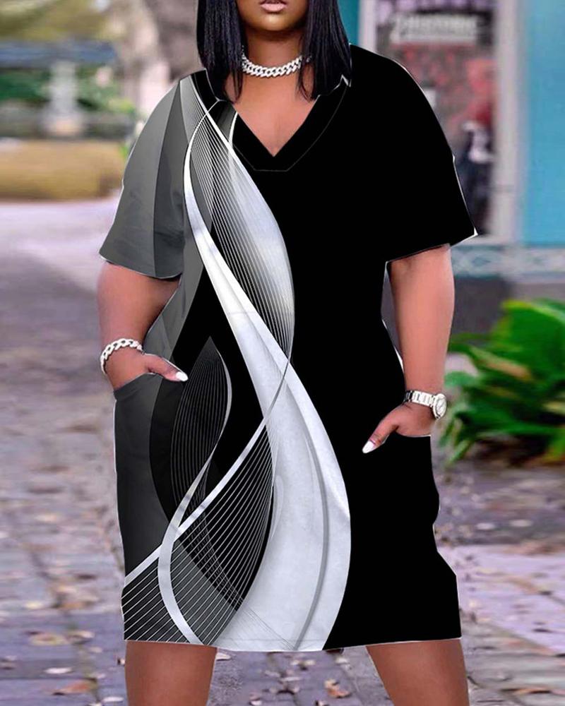 Plus Size Abstract Print Colorblock Pocket Detail Casual Dress