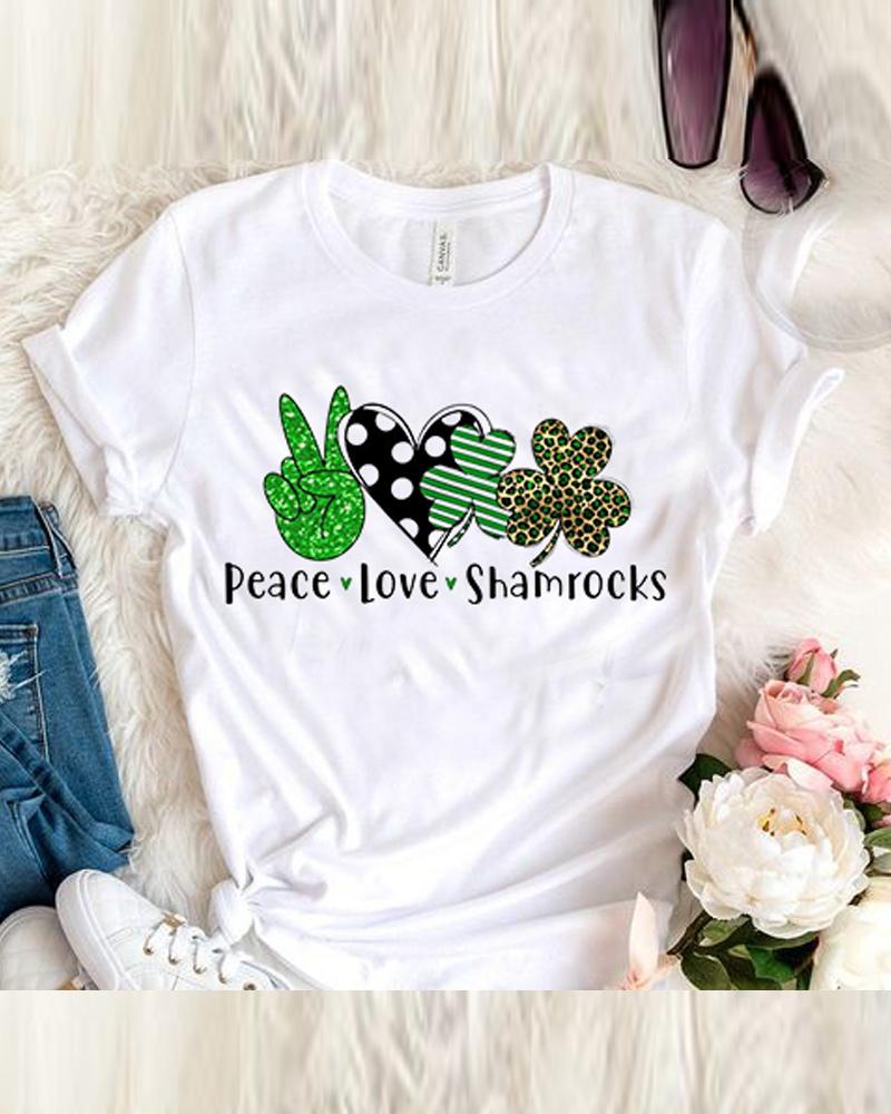 St. Patrick's Day Letter Heart Clover Print Casual T-shirt