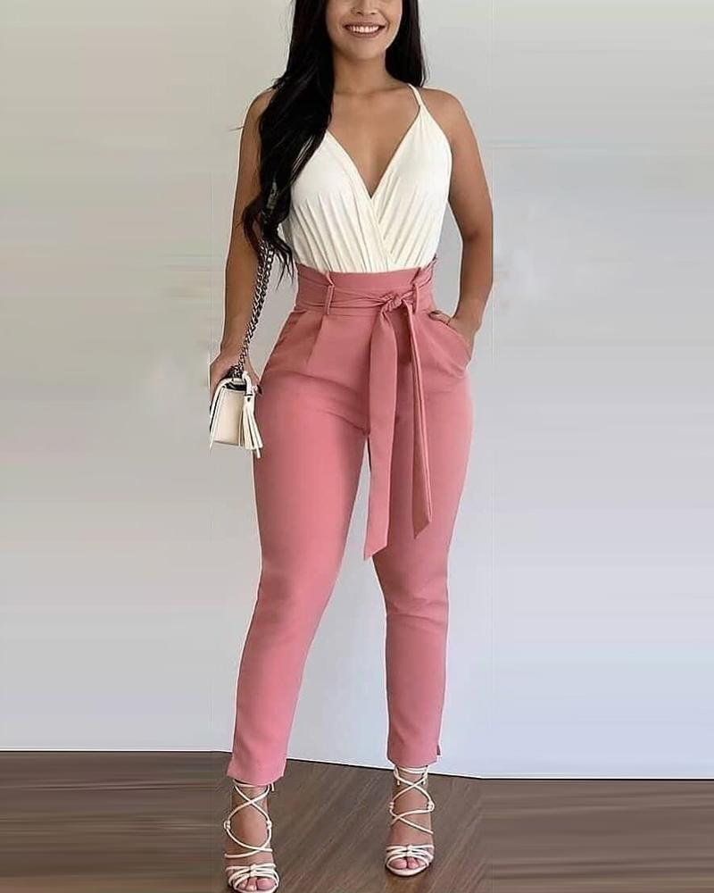 Style:Casual Type:Suit Sets Material:97%Polyester,3%Spandex Neckline:V-Neck Sleeve Style:Sleeveless Length:Regular Pattern Type:Plain Fit Type:Regular With Belt:No Occasion:Daily Package Include:2PCS