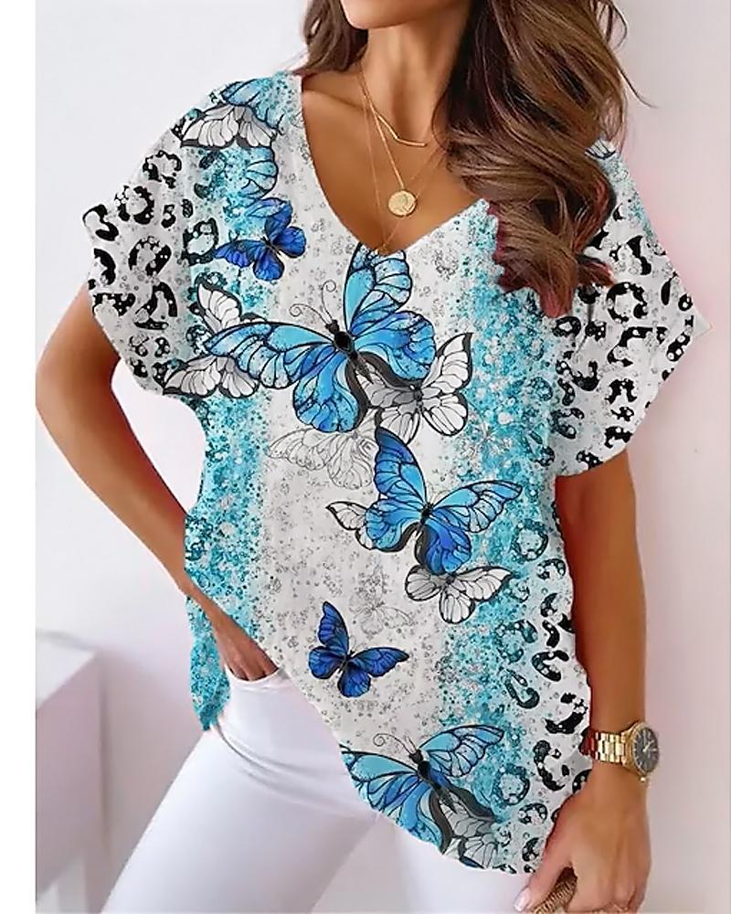 Style:Casual,Chic Type:Blouses Material:100%Polyester Neckline:V-Neck Sleeve Style:Short Sleeve Length:Regular Pattern Type:Butterfly,Leopard Decoration:Others Fit Type:Regular Occasion:Daily Package Include:1* Blouse Fabric Elasticity:Non-Stretch Sleeve Type:Batwing Sleeve Sheer:No Care Instructions:Machine wash or professional dry clean