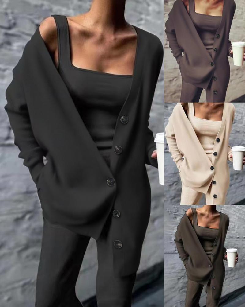 Tank Top & Pants Set With Buttoned Cardigan