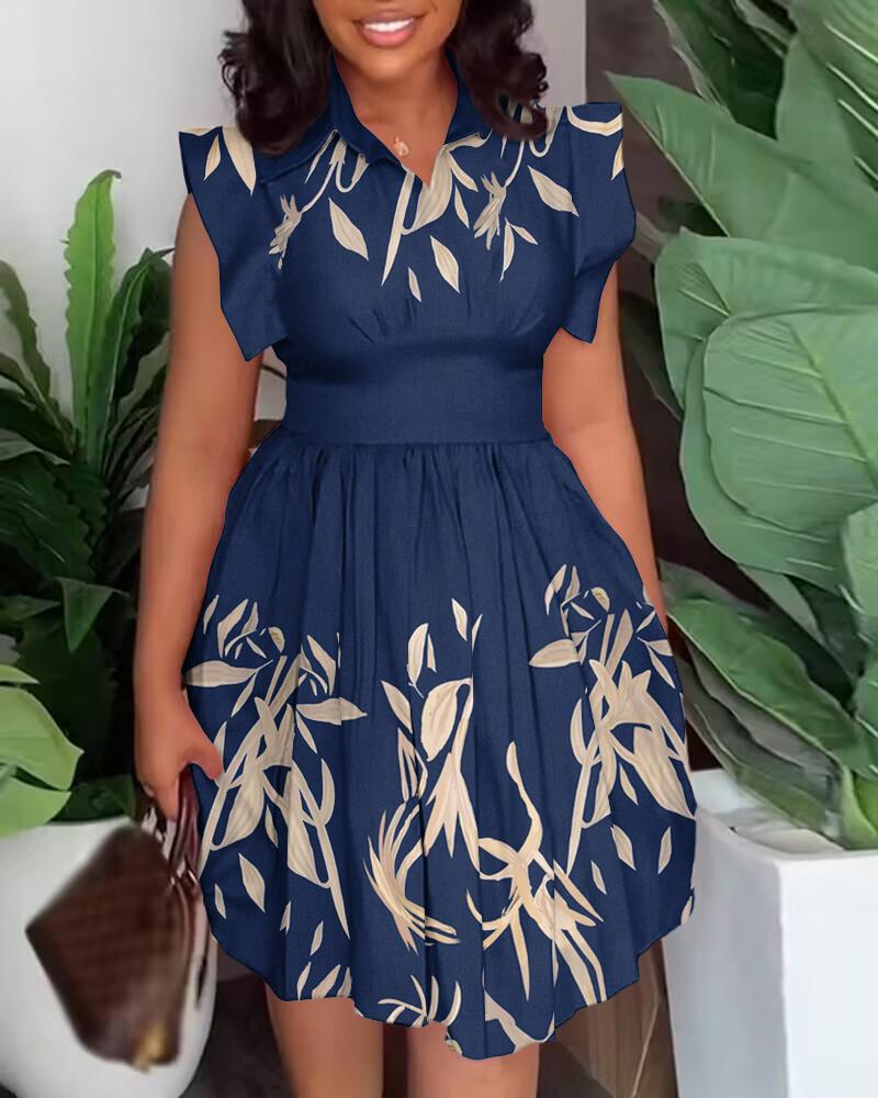 Plants Print Flutter Sleeve Pleated Casual Dress