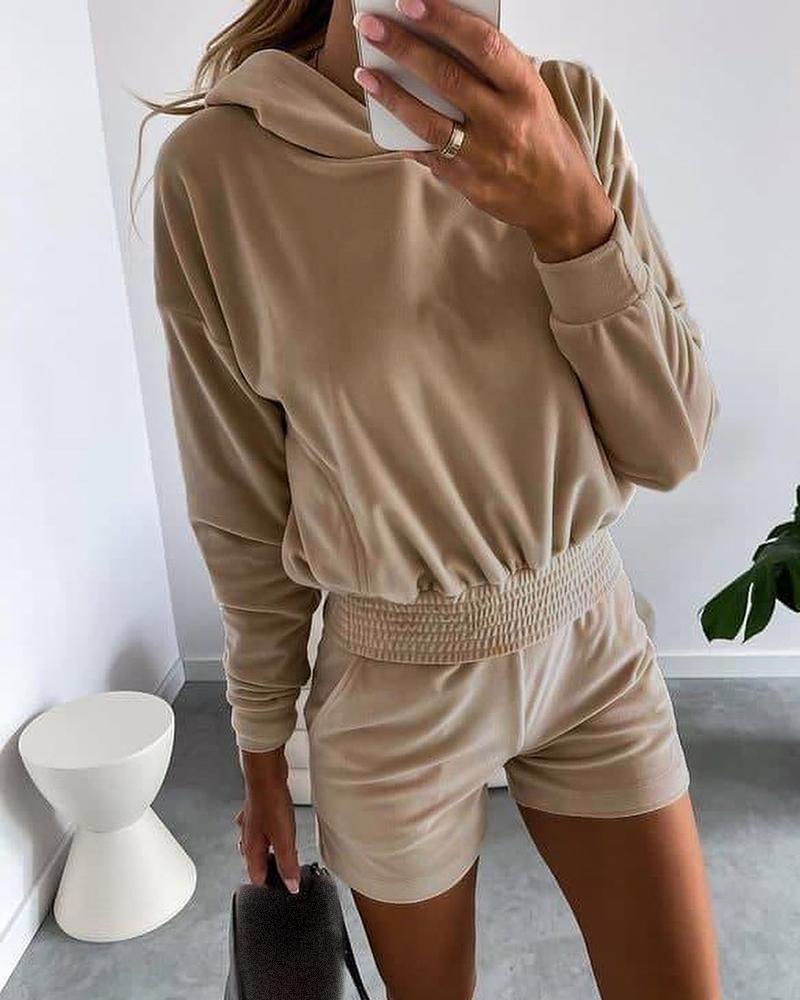 Style:Casual,Chic Type:Shorts Set Material:97%Polyester,3%Spandex Neckline:Hooded Sleeve Style:Long Sleeve Length:Above Knee Pattern Type:Plain Decoration:Pocket Fit Type:Regular Occasion:Daily Package Include:Shorts Set