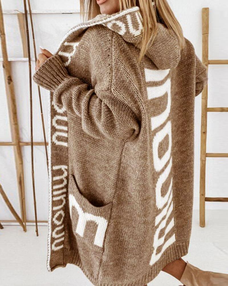 Letter Pattern Long Sleeve Hooded Knit Cardigan