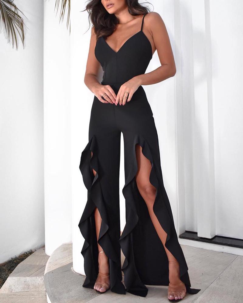 Style:Chic,Sexy Type:Jumpsuit Material:100%Polyester Neckline:V-Neck Sleeve Style:Spaghetti Strap Length:Long Pattern Type:Plain Decoration:Ruffles Fit Type:Regular Occasion:Daily,Vacation Package Include:1*Jumpsuit