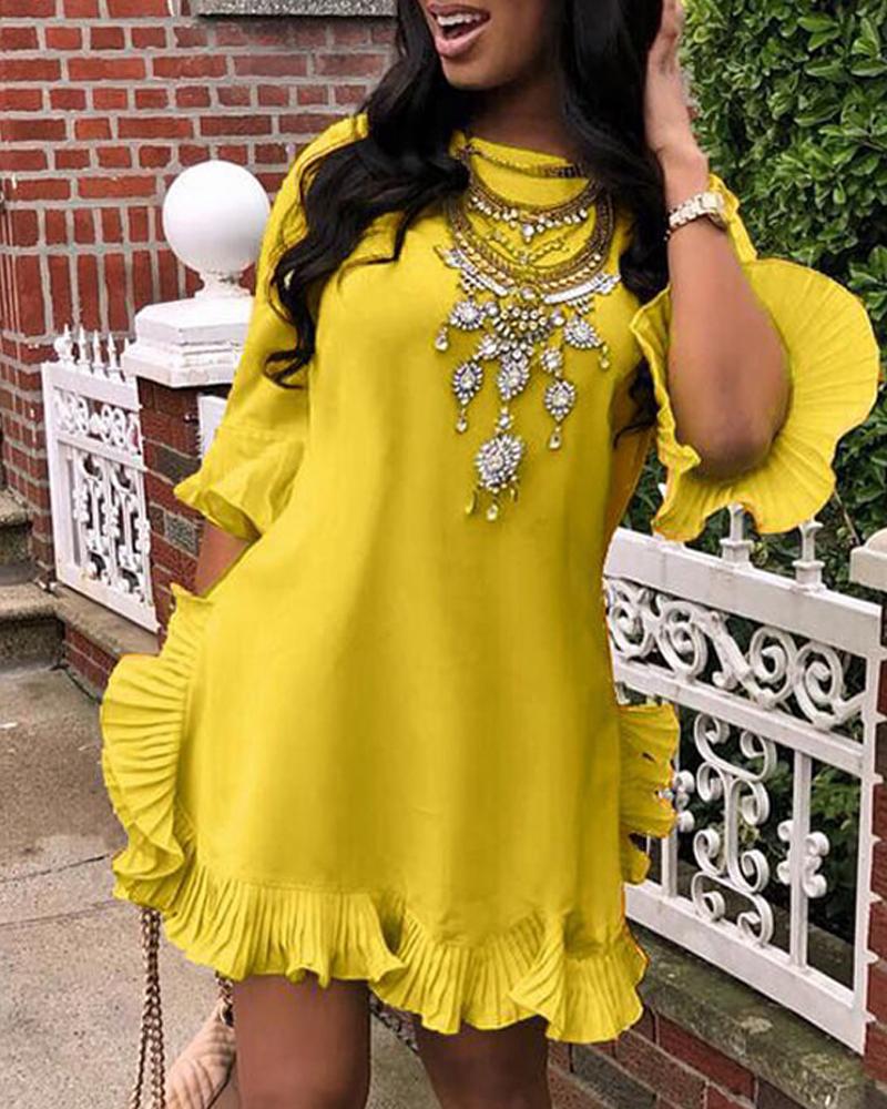 Style:Chic Type:A Line Material:100%Polyester Neckline:Round Neck Sleeve Style:Bell Sleeve,Three Quarters Length:Mini Pattern Type:Plain Decoration:Ruffles Fit Type:Regular Occasion:Daily Package Include:1* Dress Fabric Elasticity:Slight Stretch Sheer:No Care Instructions:Machine wash or professional dry clean Waist Line:Natural