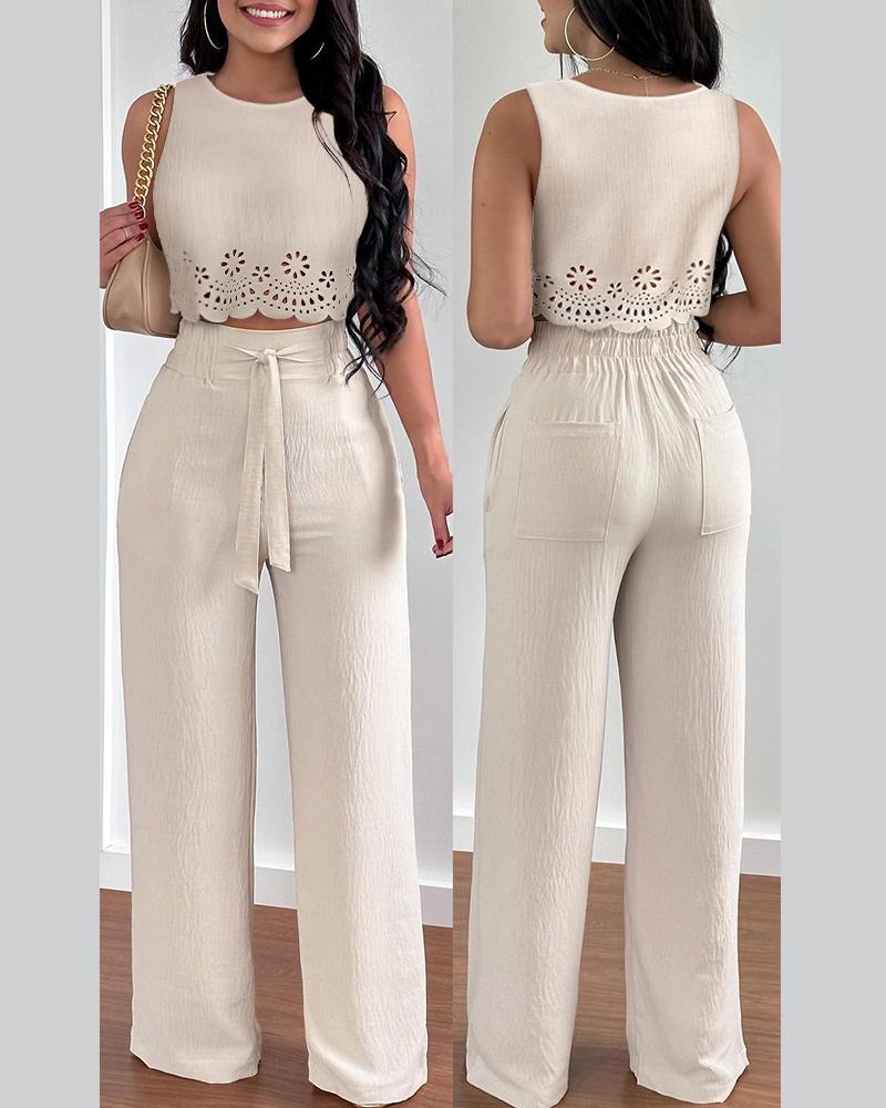 Style:Casual Type:Pants Sets Material:Polyester Neckline:Round Neck Sleeve Style:Sleeveless Length:Long Pattern Type:Plain Decoration:Hollow-out,Pocket,Scallop,Tied Detail Fit Type:Regular Occasion:Daily,Vacation Package Include:1*Pants Set Fabric Elasticity:Slight Stretch Sheer:No Care Instructions:Machine wash or professional dry clean