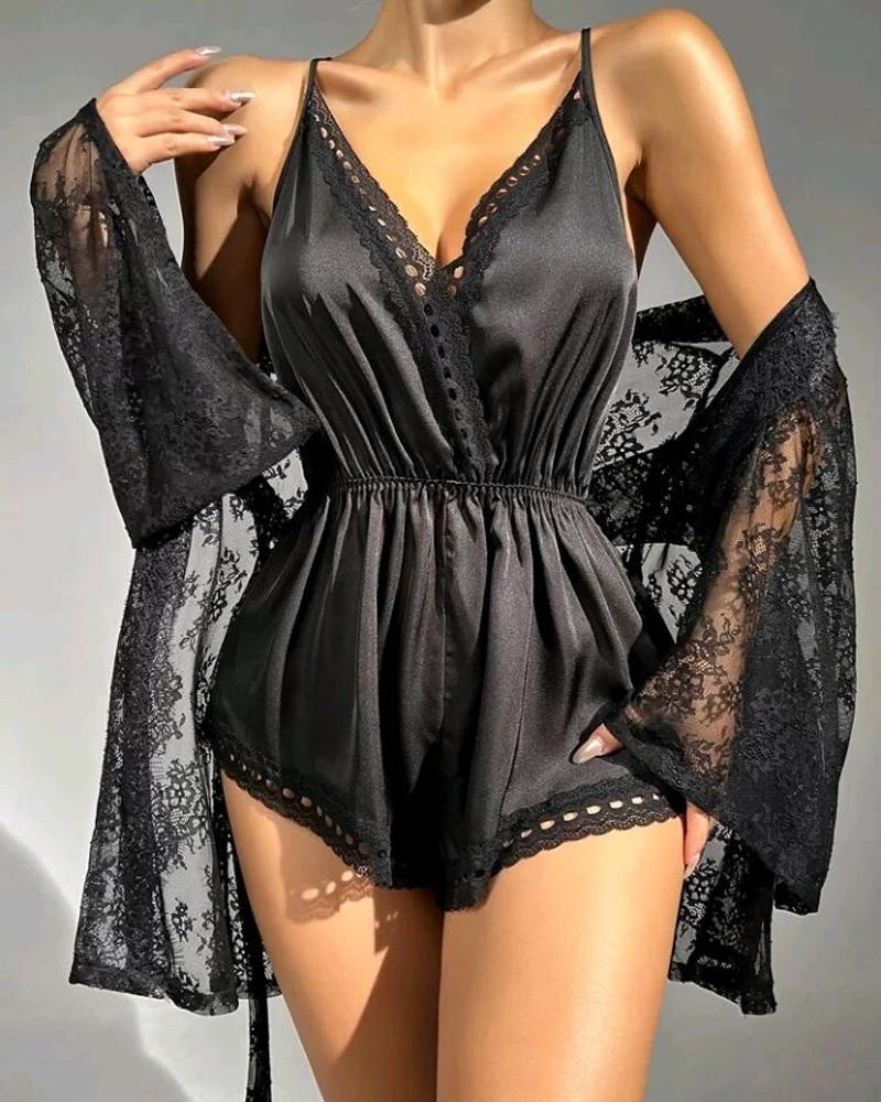 Crisscross Backless Sleep Onesie With Lace Robe
