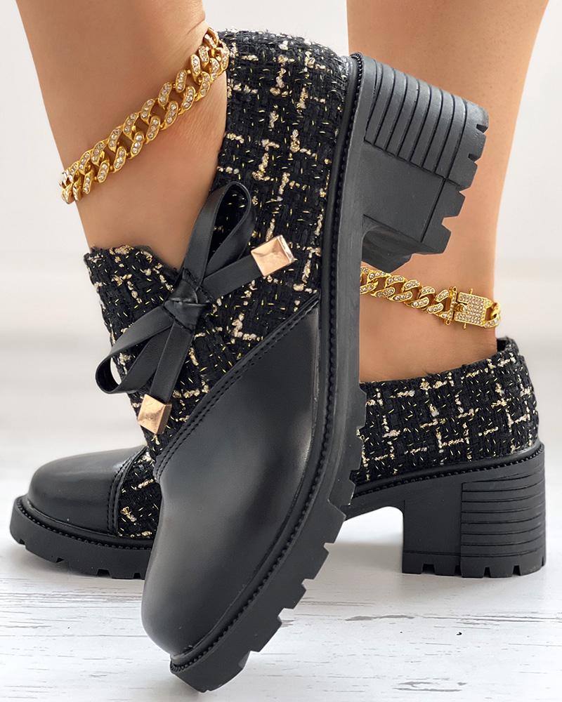 Tweed Patch Bowknot Decor Chunky Heel Loafers