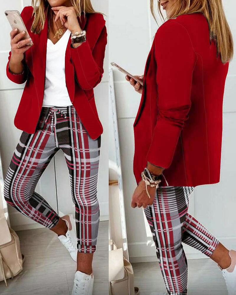 Style:Chic,Elegant Type:Blazer Sets Material:95%Polyester,5%Elastane Neckline:Shawl Collar Sleeve Style:Long Sleeve Length:Long Pattern Type:Plaid,Plain Decoration:Button,Drawstring,Pocket Fit Type:Regular Occasion:Daily,Work Package Include:1*Blazer Set Fabric Elasticity:High Stretch