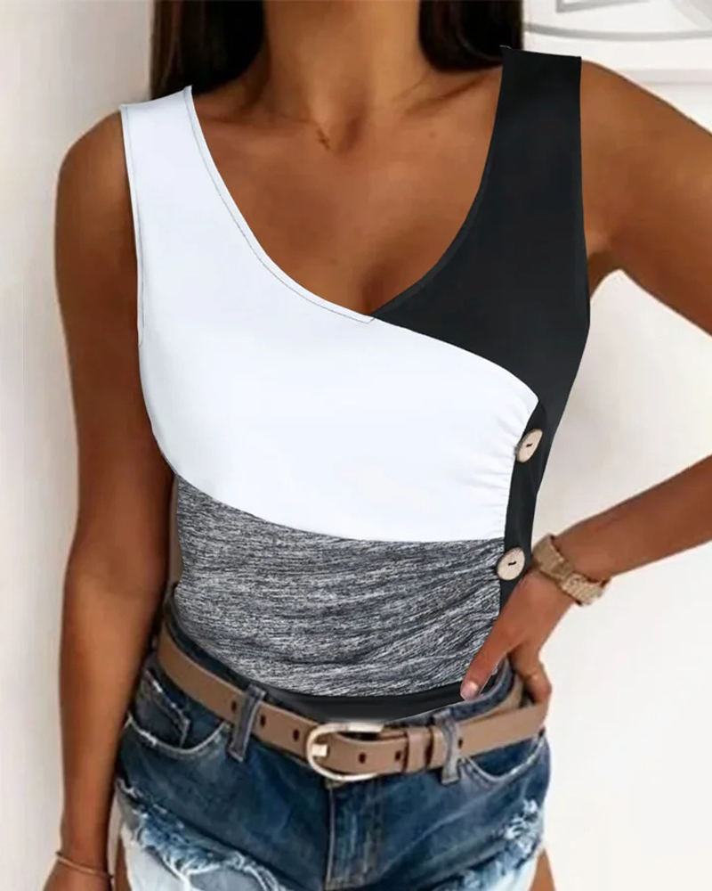 Style:Casual Type:Tank Material:95%Polyester,5%Elastane Neckline:V-Neck Sleeve Style:Sleeveless Length:Regular Pattern Type:Colorblock Decoration:Button Fit Type:Regular Occasion:Daily Package Include:1*Top Fabric Elasticity:Medium Stretch