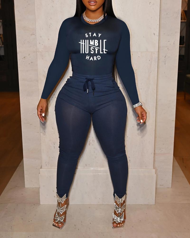 Letter Print Long Sleeve Top & Drawstring Pants Set