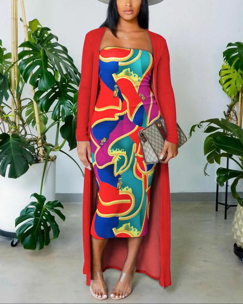 Abstract Print Bodycon Tube Dress With Longline Coat
