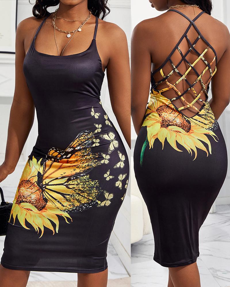 Butterfly Sunflower Print Fishnet Backless Bodycon Dress