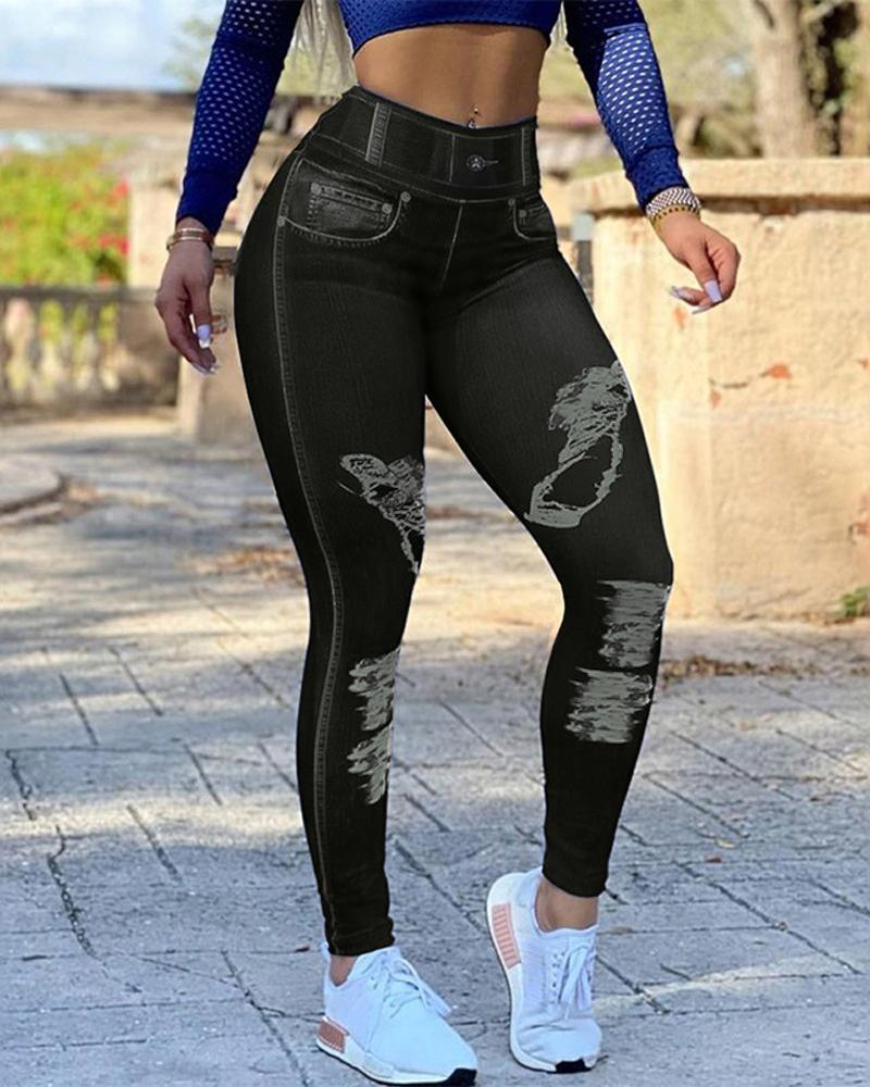 Women's Leggings Faux Denim Printed High Waist Butt Lift Active Pants