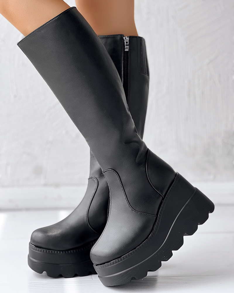 Round Toe Side Zipper Wedge Platform PU Boots