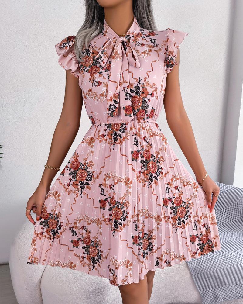 Style:Casual Type:Pleated Material:Polyester Neckline:Tie Neck Sleeve Style:Short Sleeve Length:Mini Pattern Type:Floral Decoration:Tied Detail Fit Type:Regular Occasion:Daily Package Include:1* Dress Fabric Elasticity:Non-Stretch Sleeve Type:Flutter Sleeve Sheer:No Care Instructions:Machine wash or professional dry clean