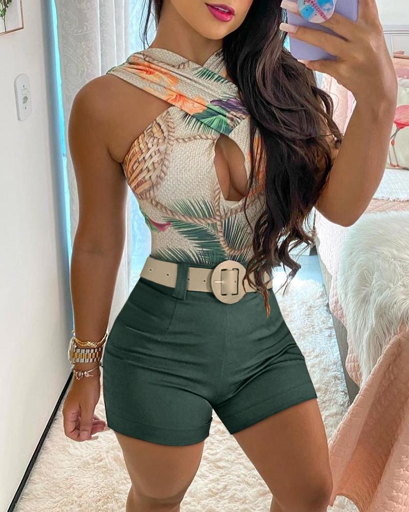 Cross Halter Cutout Front Top & Tropical Print Shorts Set
