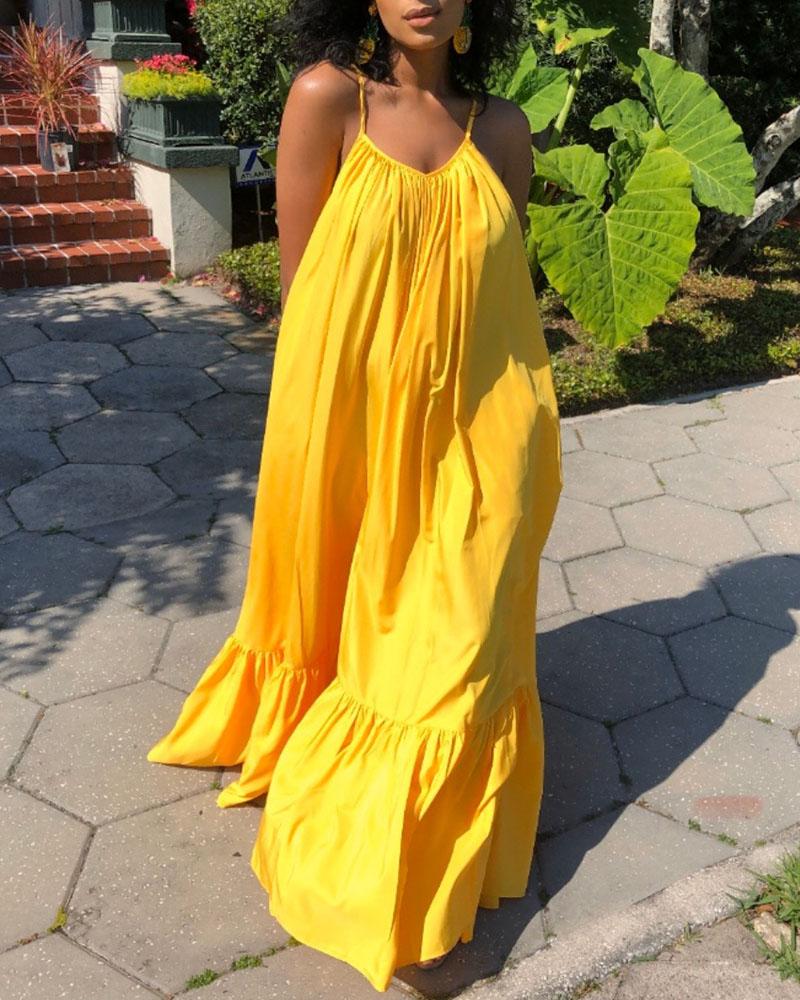 Style:Casual Type:A Line Material:Polyester Neckline:V-Neck Sleeve Style:Spaghetti Strap Length:Maxi Pattern Type:Plain Decoration:Ruched,Ruffles Fit Type:Regular Occasion:Daily Package Include:1*Dress Fabric Elasticity:Slight Stretch Sheer:No Care Instructions:Machine wash or professional dry clean