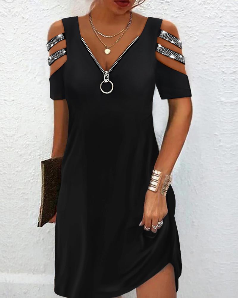 Style:Casual,Chic Type:A Line Material:97%Polyester,3%Spandex Neckline:Cold Shoulder Sleeve Style:Short Sleeve Length:Mini Pattern Type:Plain Decoration:Rhinestone,Zipper Fit Type:Regular Occasion:Daily Package Include:1*Dress Fabric Elasticity:Non-Stretch Sheer:No Care Instructions:Machine wash or professional dry clean
