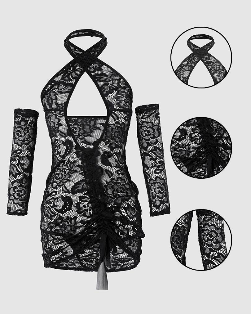 Style:Romantic,Sexy Type:Babydolls Material:Lace Neckline:Halter Sleeve Style:Long Sleeve Length:Mini Pattern Type:Plain Decoration:Cutout,Drawstring,Ruched Fit Type:Skinny Occasion:Home Package Include:1*Babydoll (With Thong)