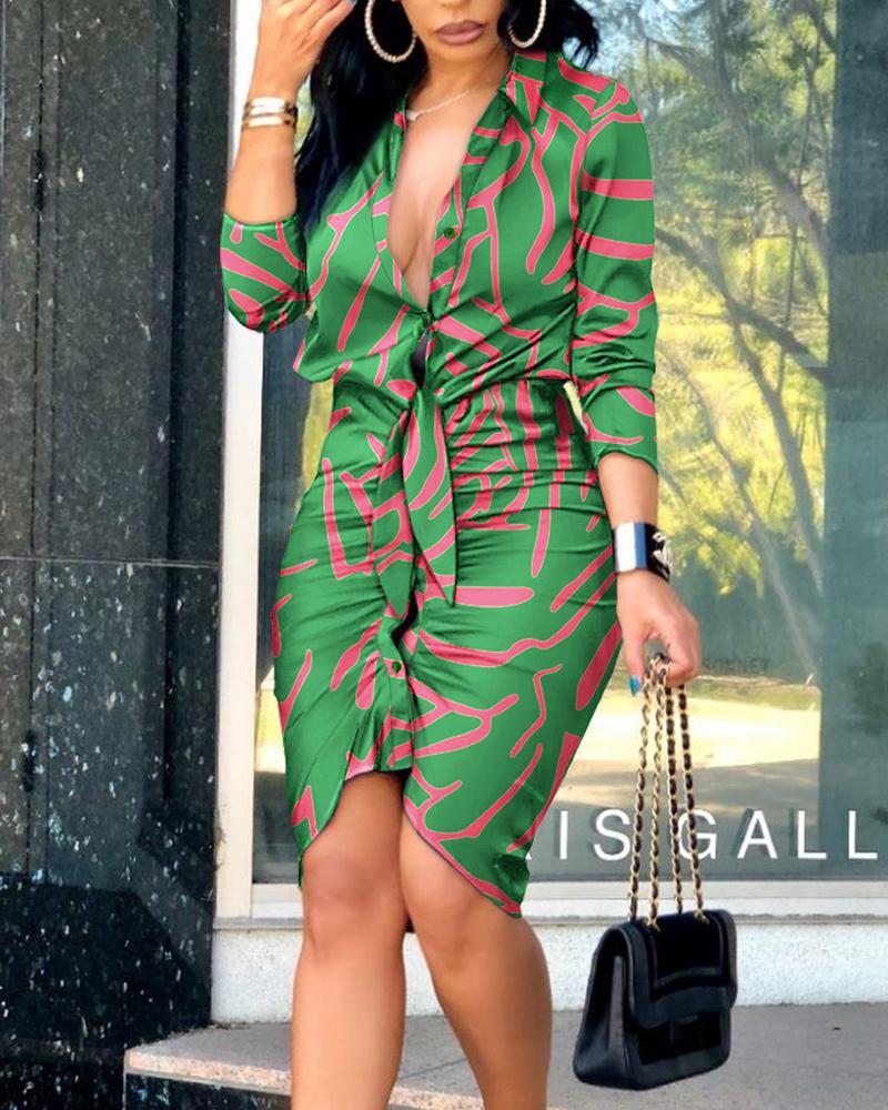 Style:Casual Type:Shirt Material:100%Polyester Neckline:Turn-down Collar Sleeve Style:Long Sleeve Length:Midi Pattern Type:Abstract Decoration:Button,Ruched,Tied Detail Fit Type:Skinny Occasion:Daily Package Include:1* Dress Fabric Elasticity:Non-Stretch Sheer:No Care Instructions:Machine wash or professional dry clean