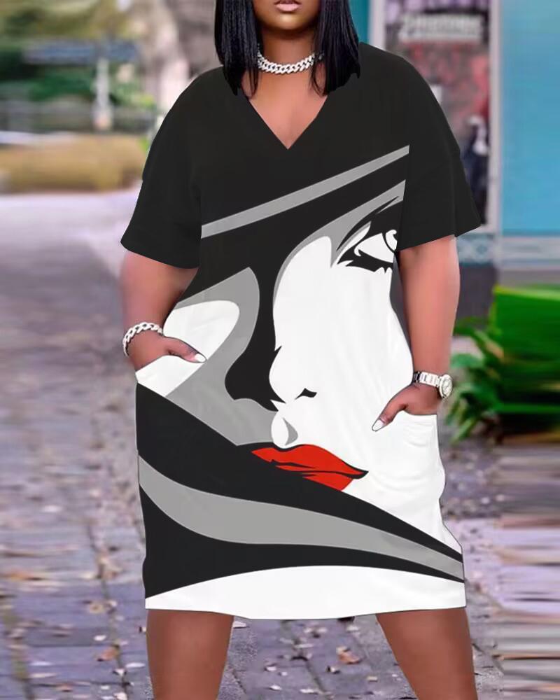 Plus Size Abstract Figure Print Pocket Design Casual Dress